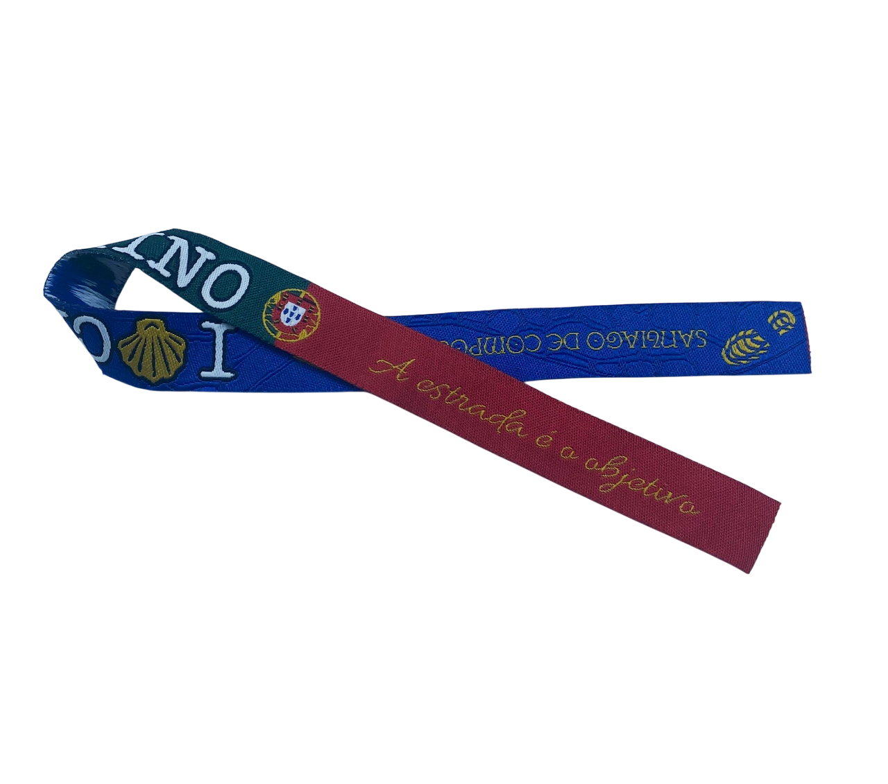 Cinta bordada en hilo de alta durabilidad con diseño de Camino de Santiago y bandera de Portugal.