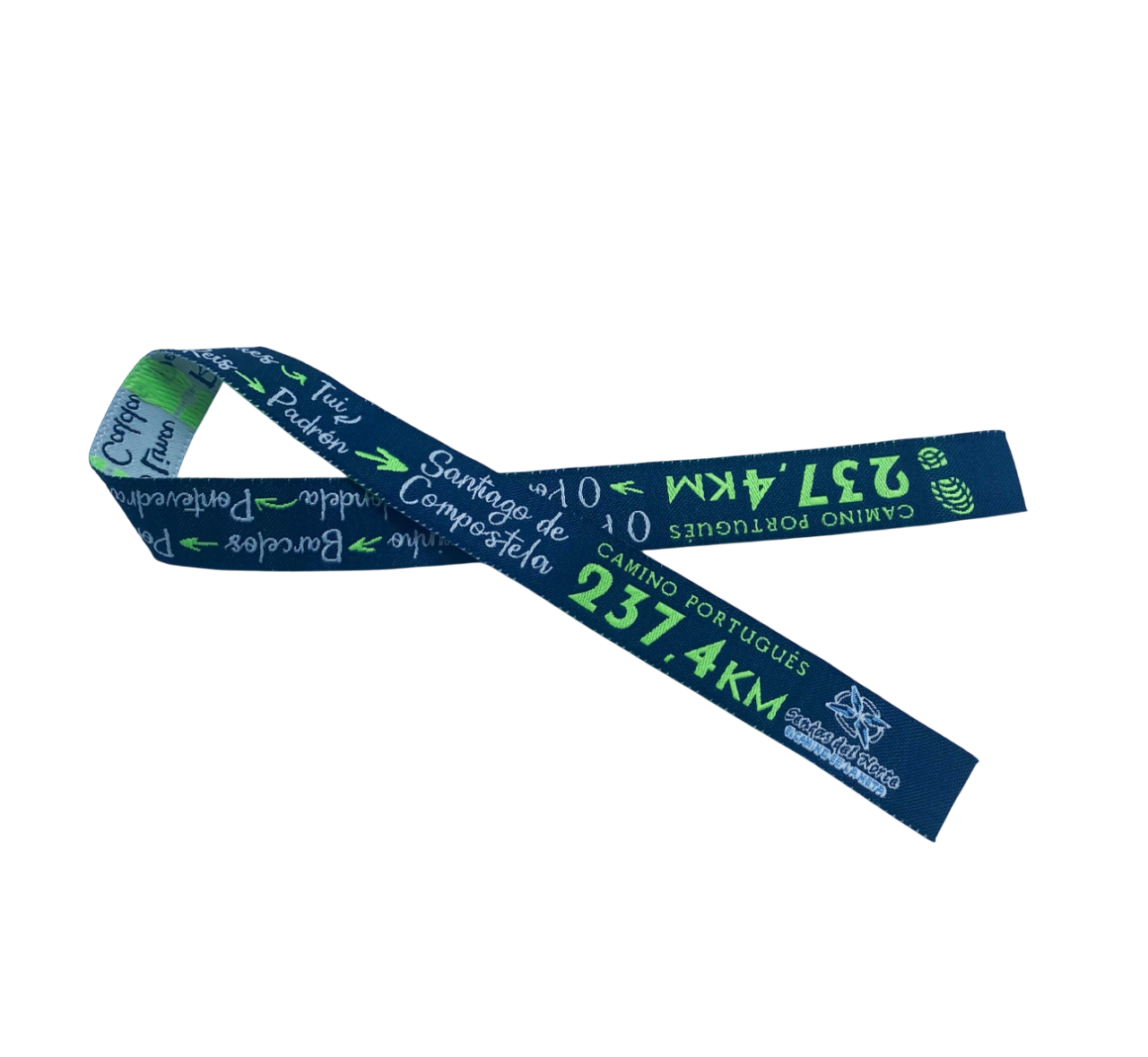Cinta 237,4 KM con cada lugar desde O Porto a Santiago, cada ciudad y pueblo por dónde vivir esta preciosa experiencia en tela bordada de alta calidad en colores flúor.
