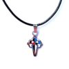 Colgante en acero inoxidable en forma de Apóstol en colores artesanales. Correa de color negro con cierre ajustable.