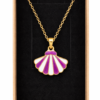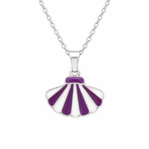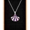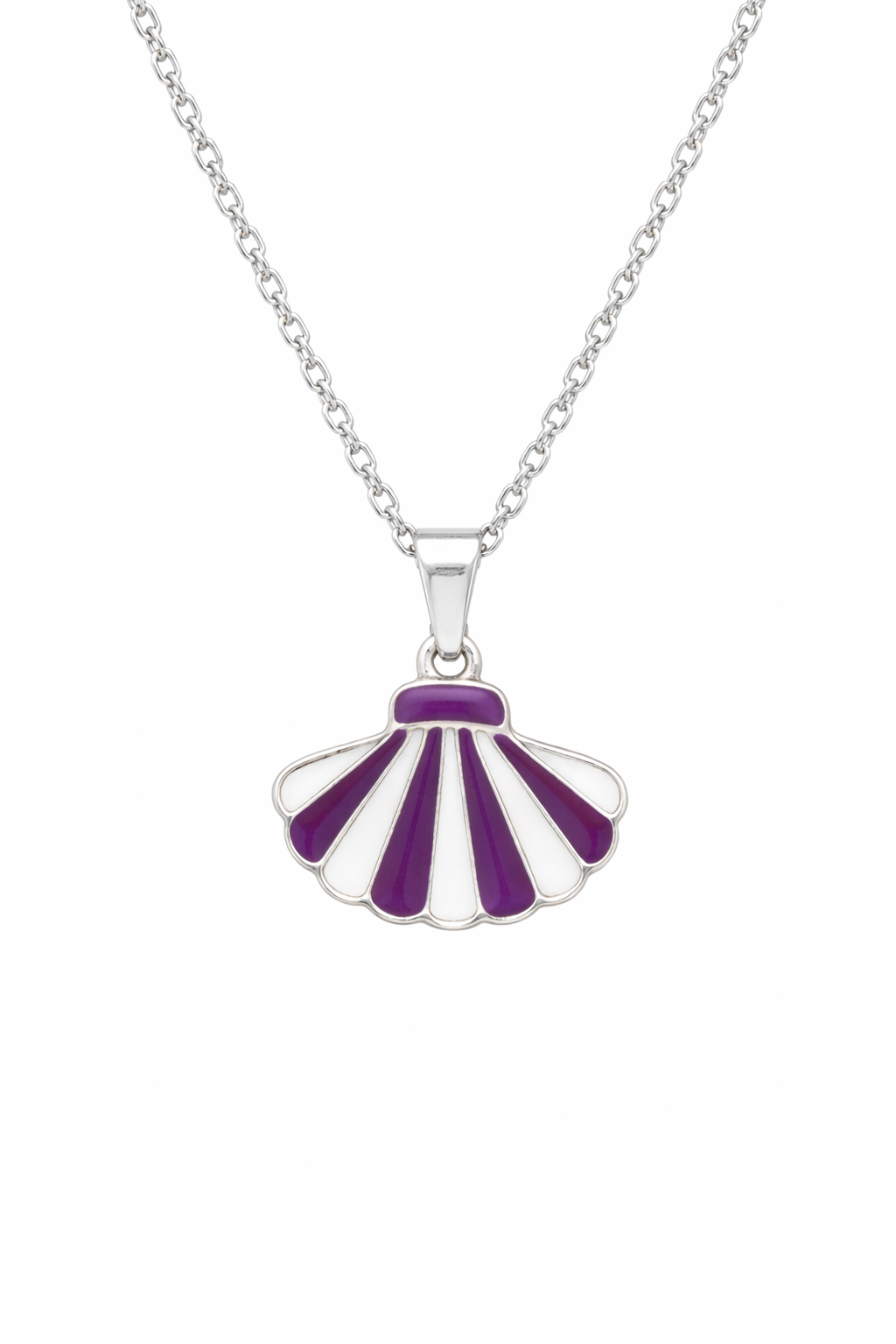 Colgante de acero en plateado, con concha esmaltada morada y blanca. Elegante, moderno y perfecto como detalle del Camino.