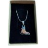 Colgante de La Santina esmaltada en acero con cadena de acero plateada. Presentada en caja.