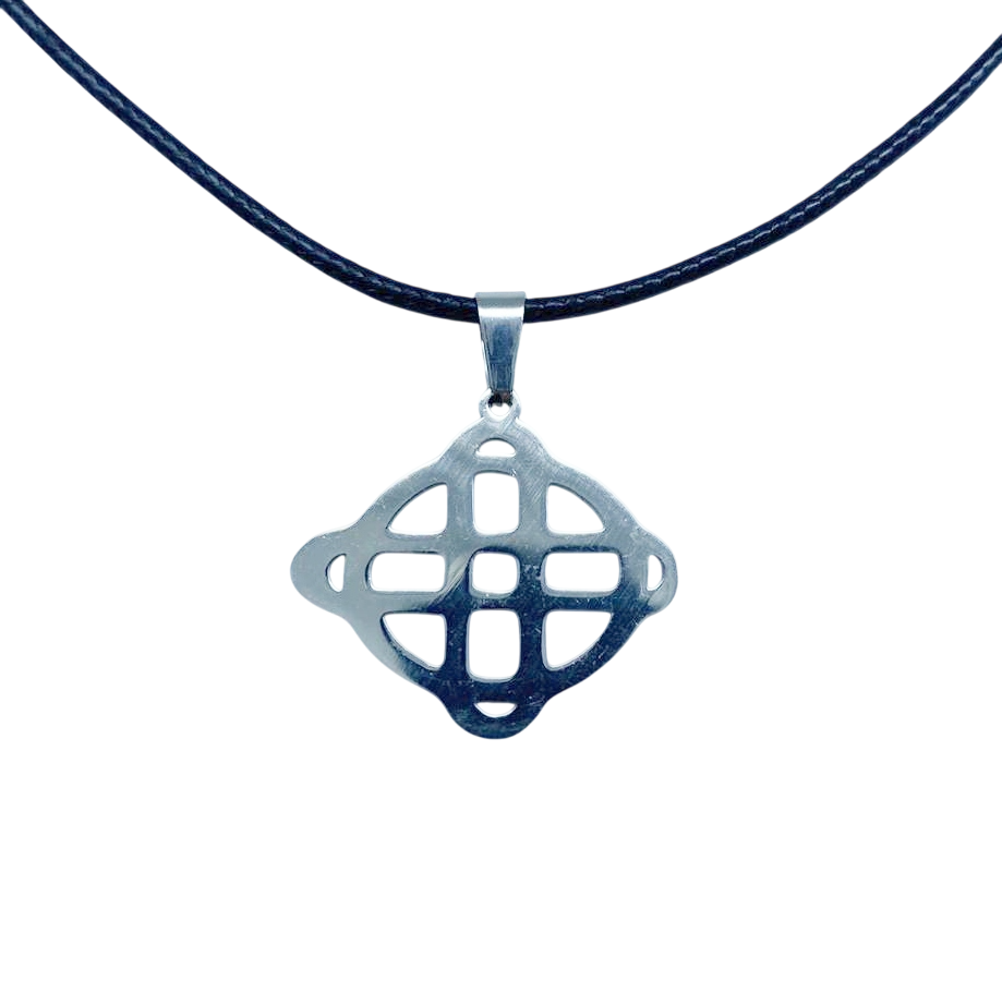 Colgante de acero con diseño de Nudo celta. Presentado con cordón negro acerado con cierre de mosquetón.