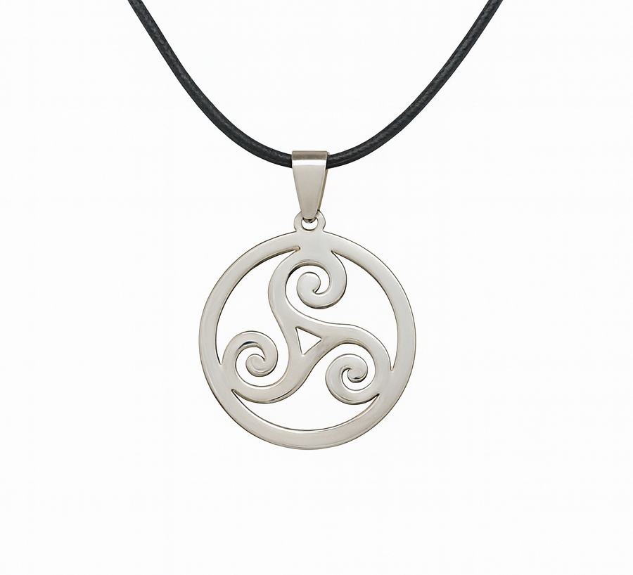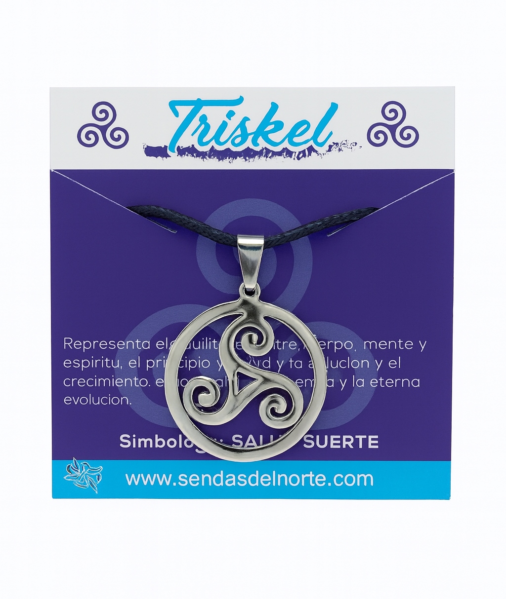 Colgante de acero con diseño Triskel. Presentado con cordón negro acerado y cierre de mosquetón, garantizando resistencia y un acabado de alta calidad.
