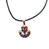 Colgante en acero inoxidable en forma de triskel en colores artesanales. Correa de color negro con cierre ajustable.