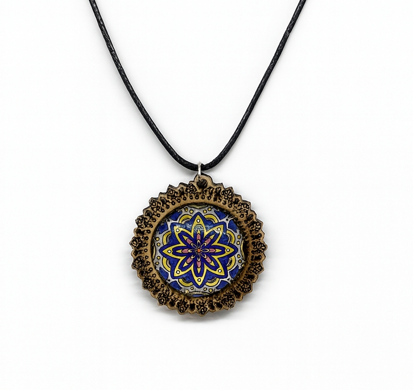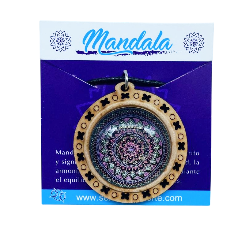 Colgante Mandala con base de madera, decorado con delicados detalles grabados en la circunferencia. Se presenta con cordón negro acerado y cierre de mosquetón. Packing en modelos y colores surtidos.