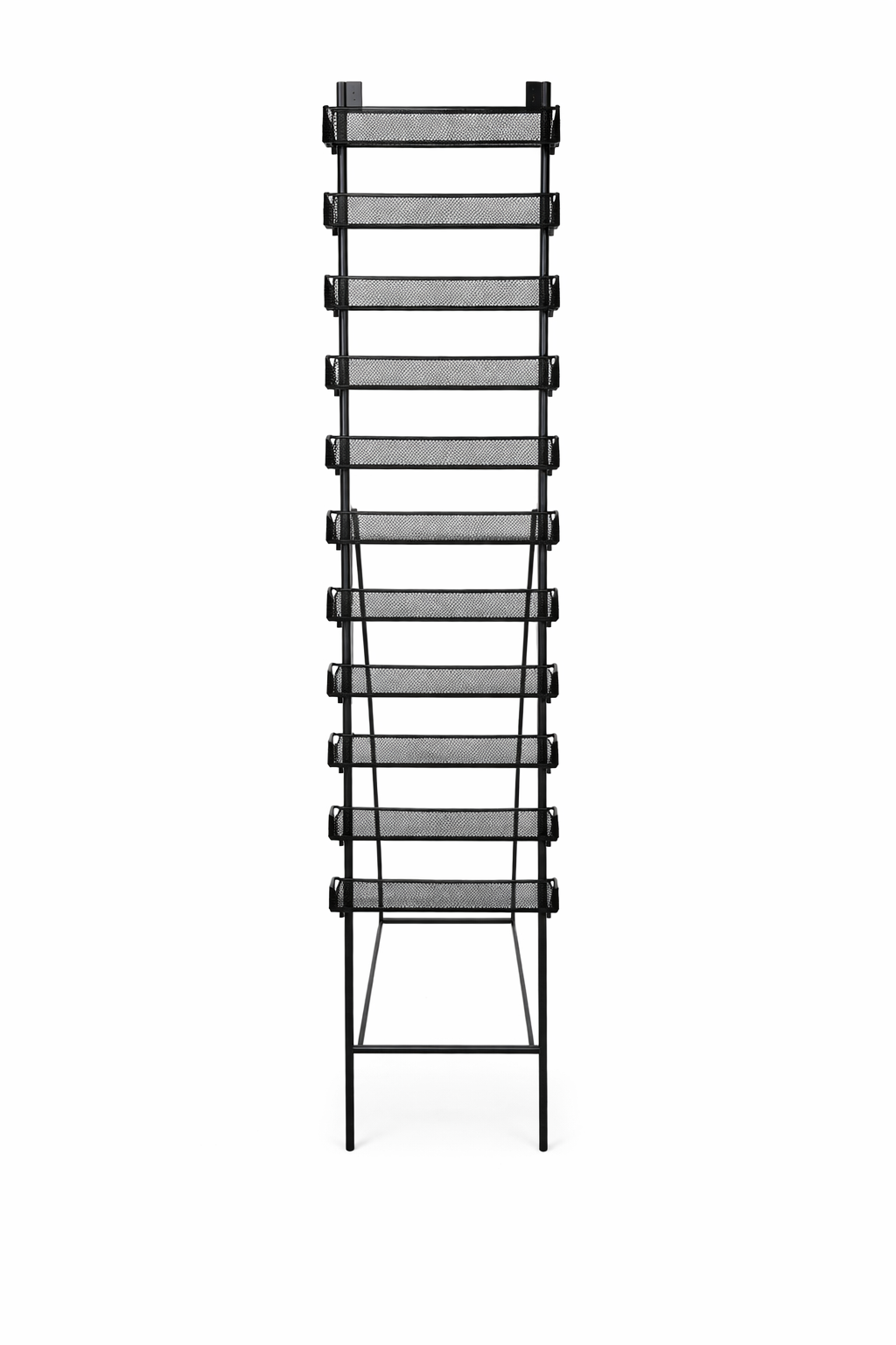 Expositor metálico exclusivo Sendas del Norte, con doce tubos metálicos en color negro de 30 cm cada uno y 150 cm de alto. Incluye soporte de pie o anclaje en pared.