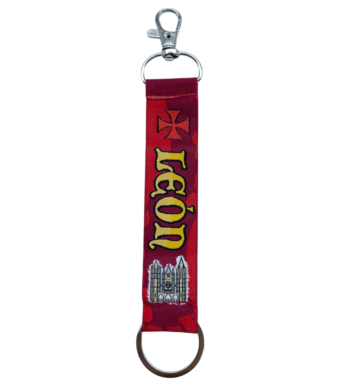 Llavero correa con impresión tejida de alta calidad, equipado con mosquetón, pinza y anilla en acero. Diseño exclusivo.