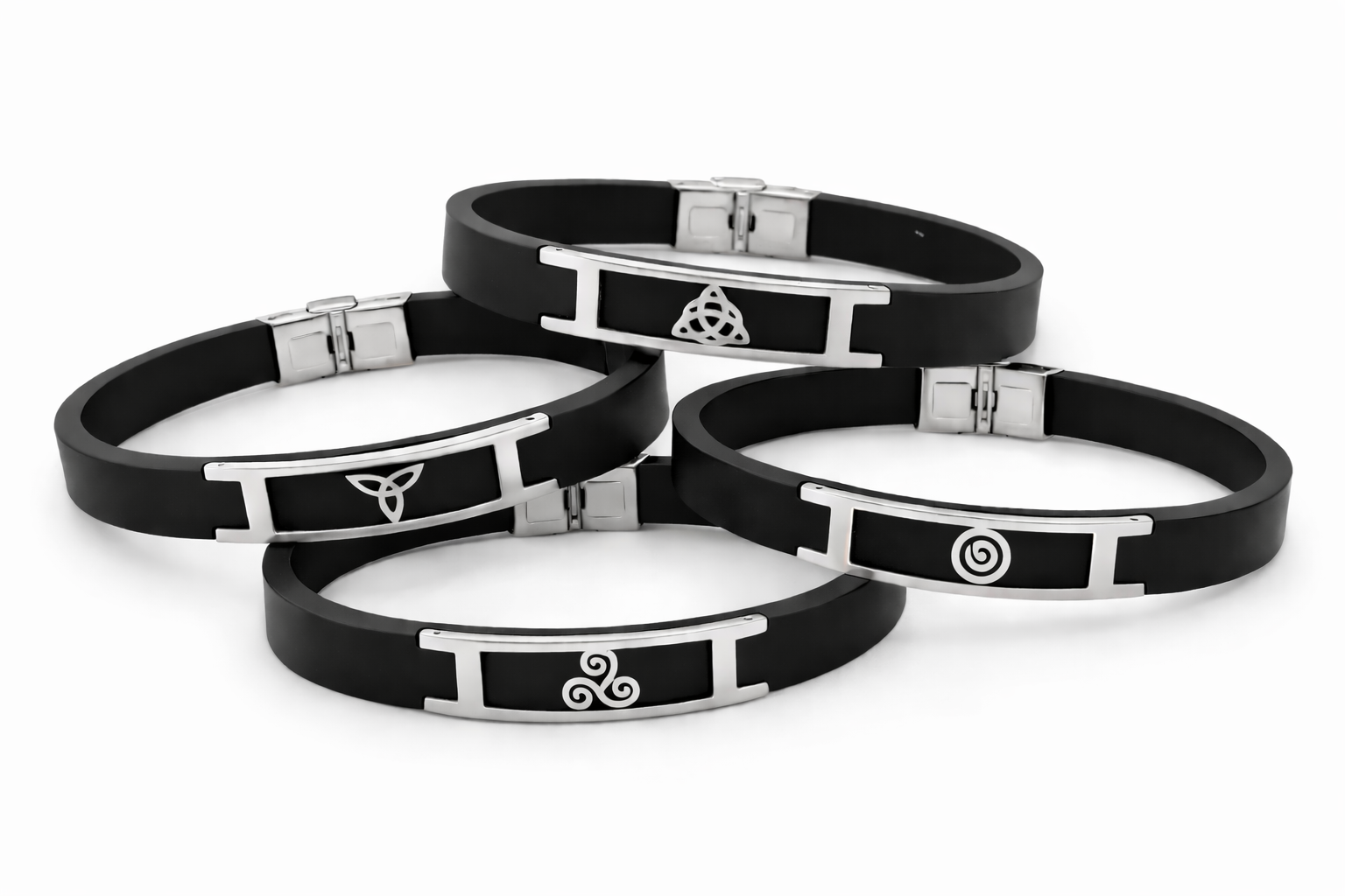 Pulsera unisex de caucho negro y acero inoxidable, con diseño de Triskel (6 unidades); Triqueta (2 unidades); Espiral (2 unidades) y Nudo (2 unidades). Moderna, cómoda y resistente, ideal para el uso diario y fácil de combinar con cualquier estilo.