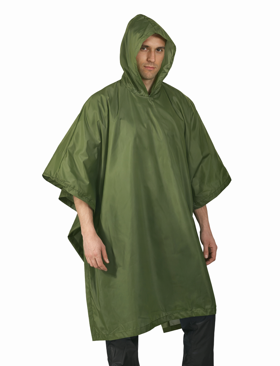 Poncho impermeable ligero color verde con capucha, ideal para peregrinos del Camino de Santiago. Protege de la lluvia y el viento, es cómodo, práctico y fácil de llevar en la mochila.