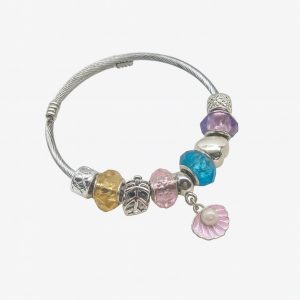Pulsera color plata en acero inoxidable estilo torque. Se presenta en dos modelos, con concha de acero esmaltada y dijes de piedra y cristal.