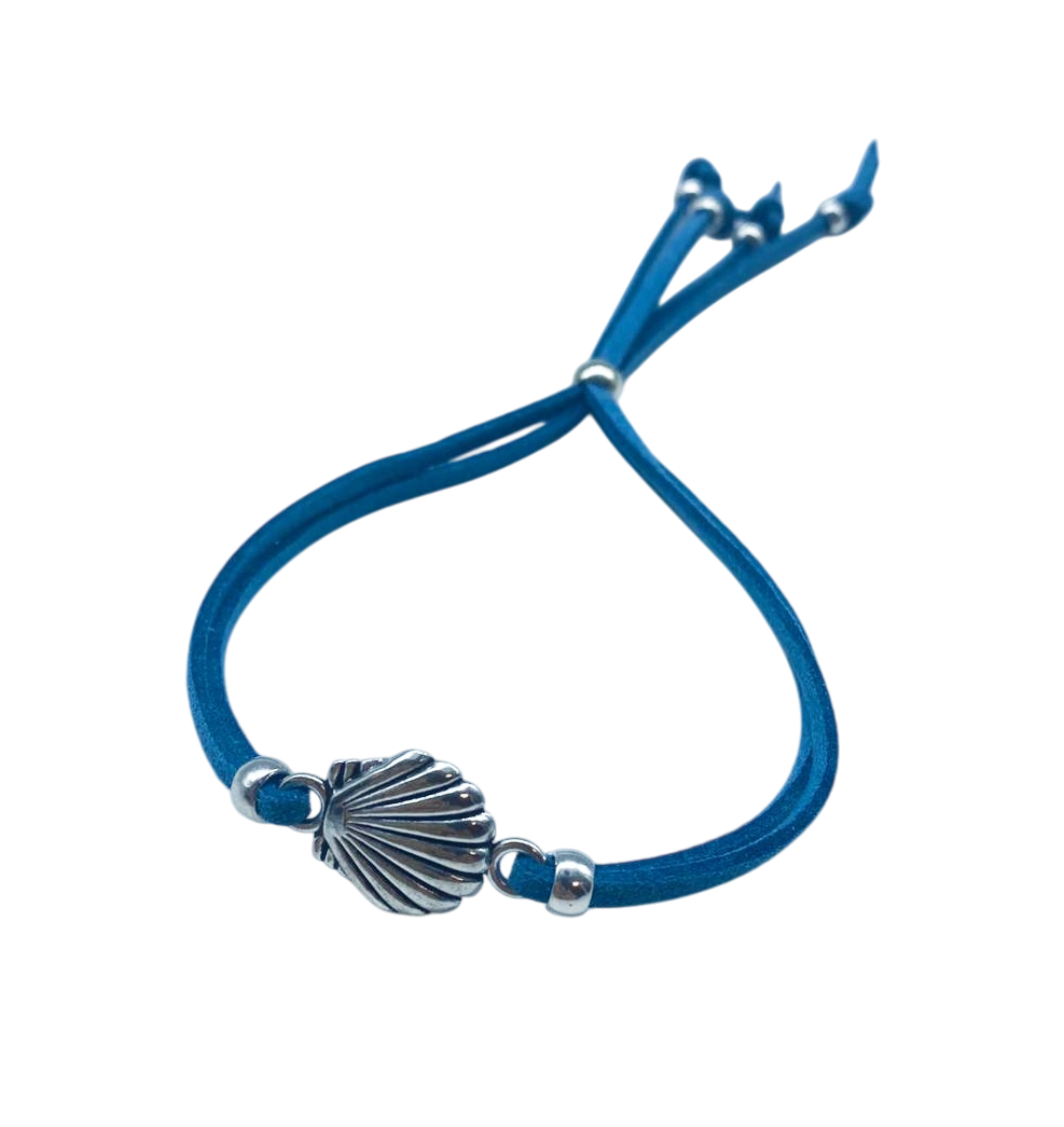 Pulsera en antelina con símbolo Concha de Santiago relieve en metal ajustable packing de diferentes colores.