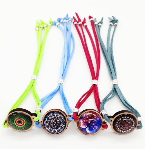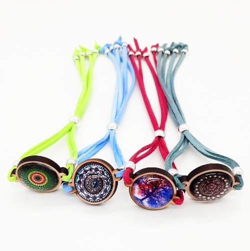 Pulsera en antelina con mandala en madera, ajustable, packing de diferentes colores.