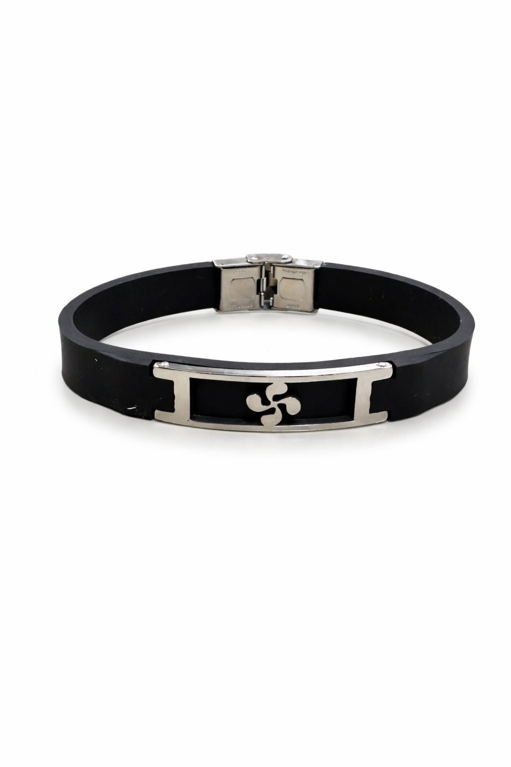 Pulsera de caucho negro con detalles en acero inoxidable y dije central Lauburu. Diseño moderno, resistente y cómodo, con cierre metálico de seguridad.