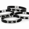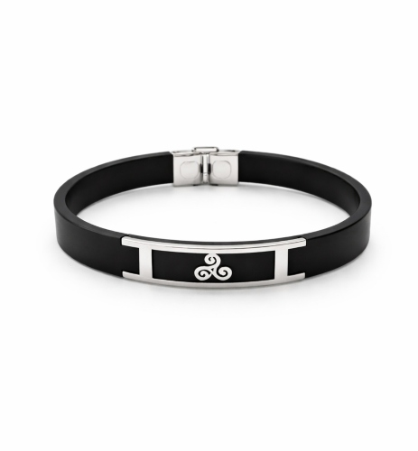 Pulsera unisex de caucho negro y acero inoxidable, con diseño de Triskel. Moderna, cómoda y resistente, ideal para el uso diario y fácil de combinar con cualquier estilo.