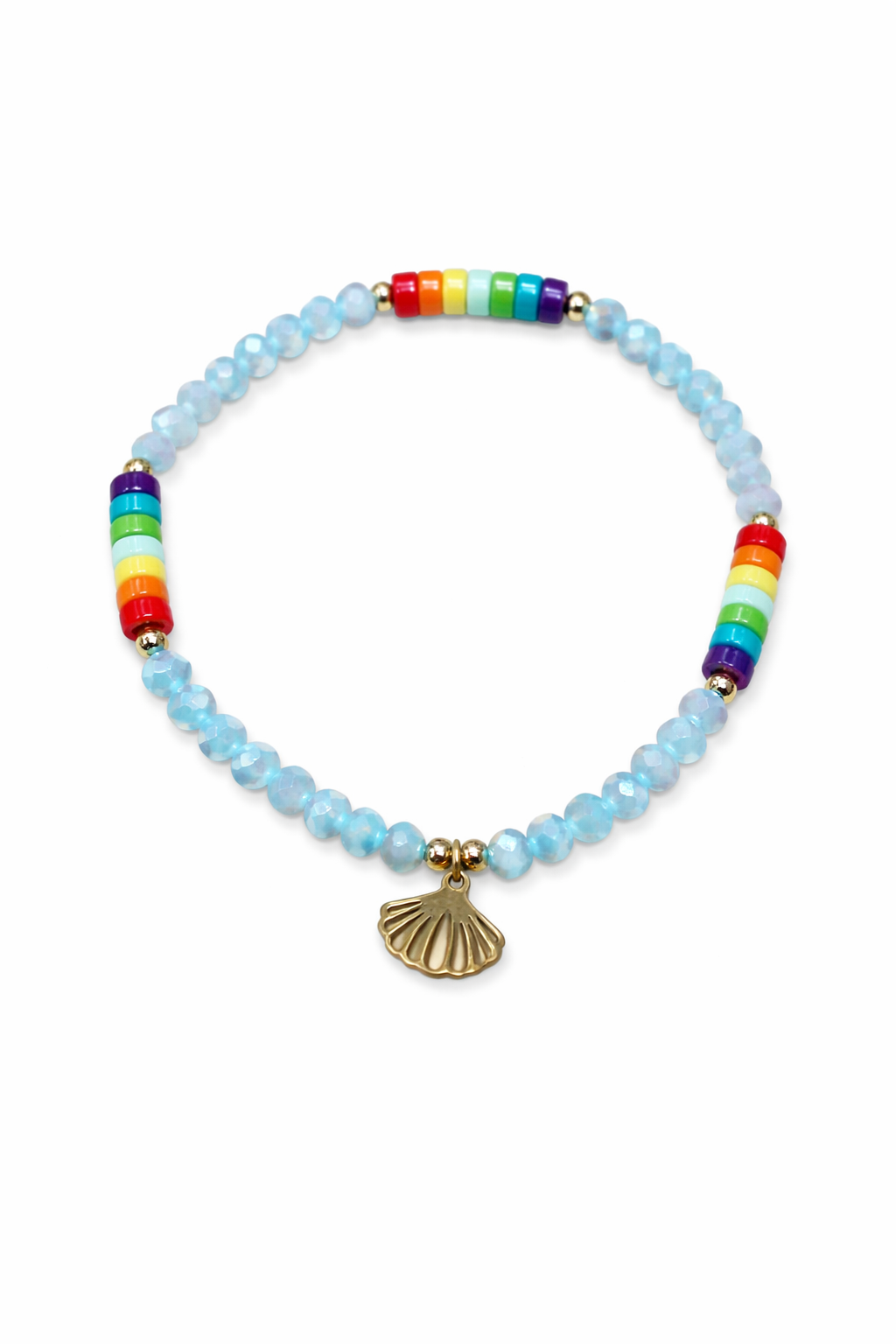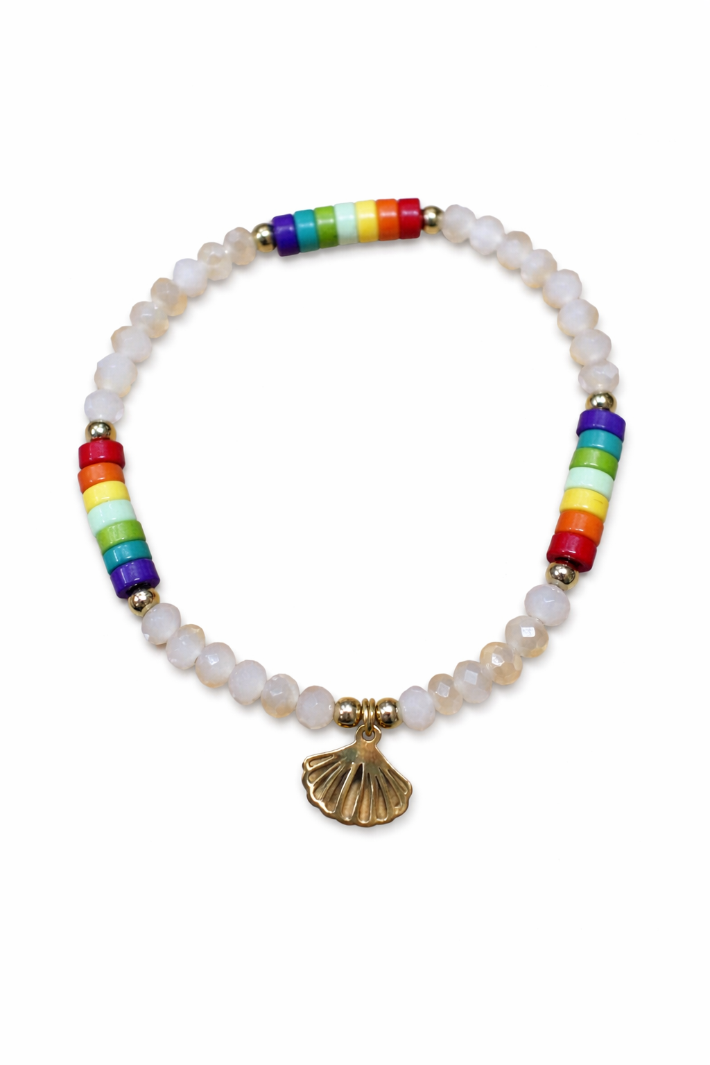 Pulsera elástica artesanal con cuentas facetadas, detalles multicolor y dije de concha dorada. Pack en 6 colores diferentes.