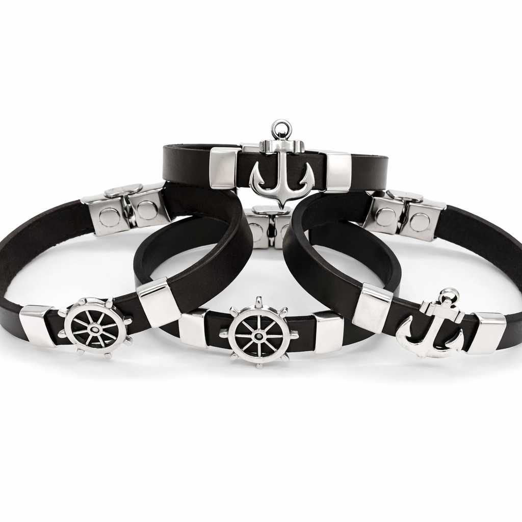 Pulsera fabricada en piel marrón y negro de 10mm ajustable con broche de acero pieza metal Ancla y Timón con embellecedores.