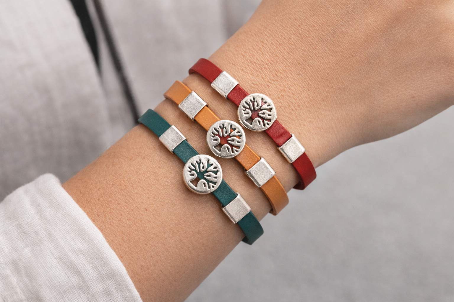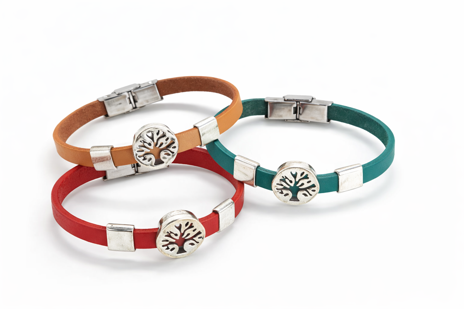 Pulsera fabricada en piel en 4 colores variadas de 6mm ajustable con broche de acero pieza metal árbol de la vida con embellecedores.