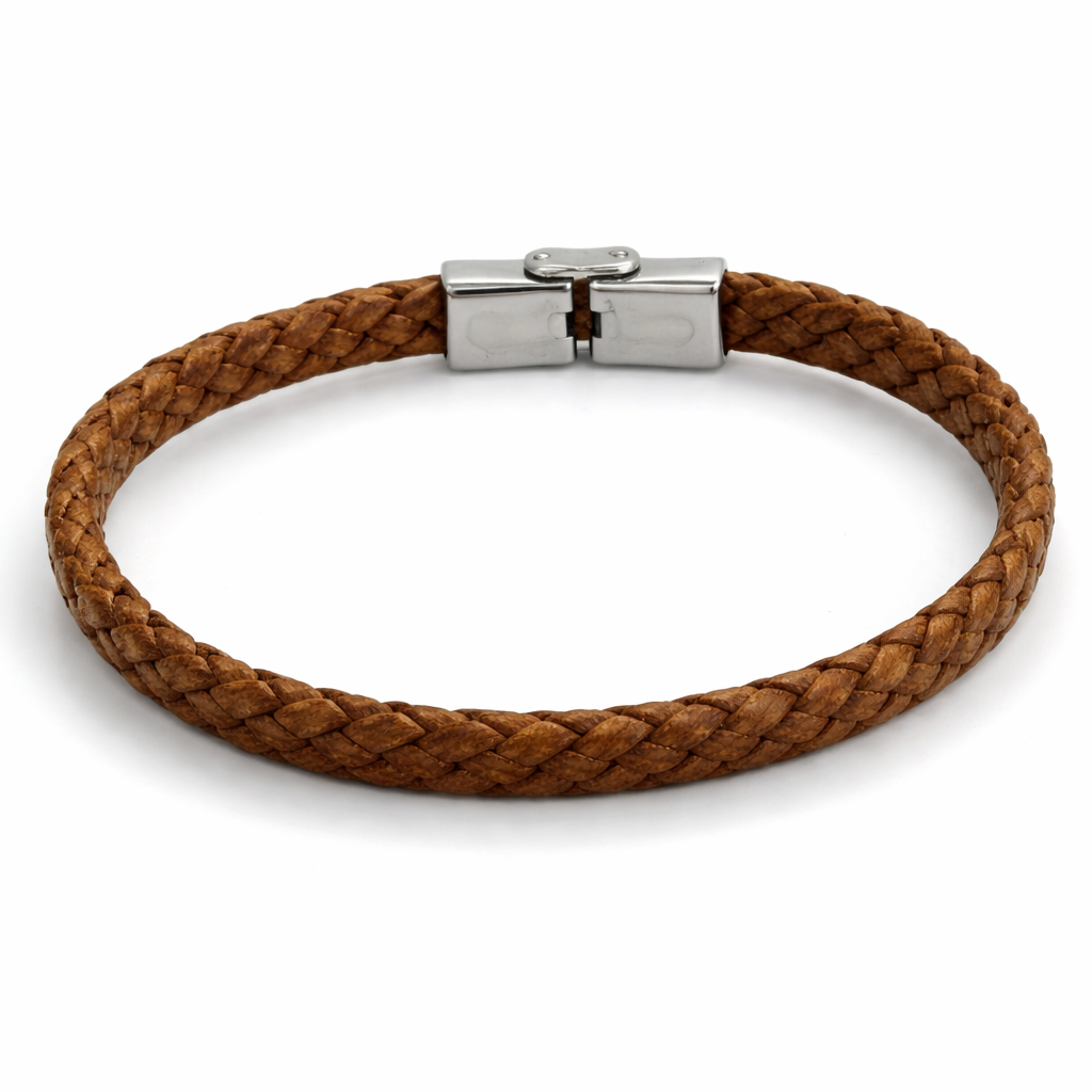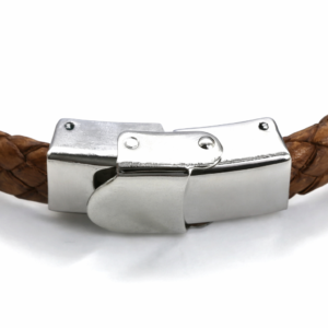 Pulsera fabricada en piel trenzado en marrón claro de 6mm ajustable con broche de acero.