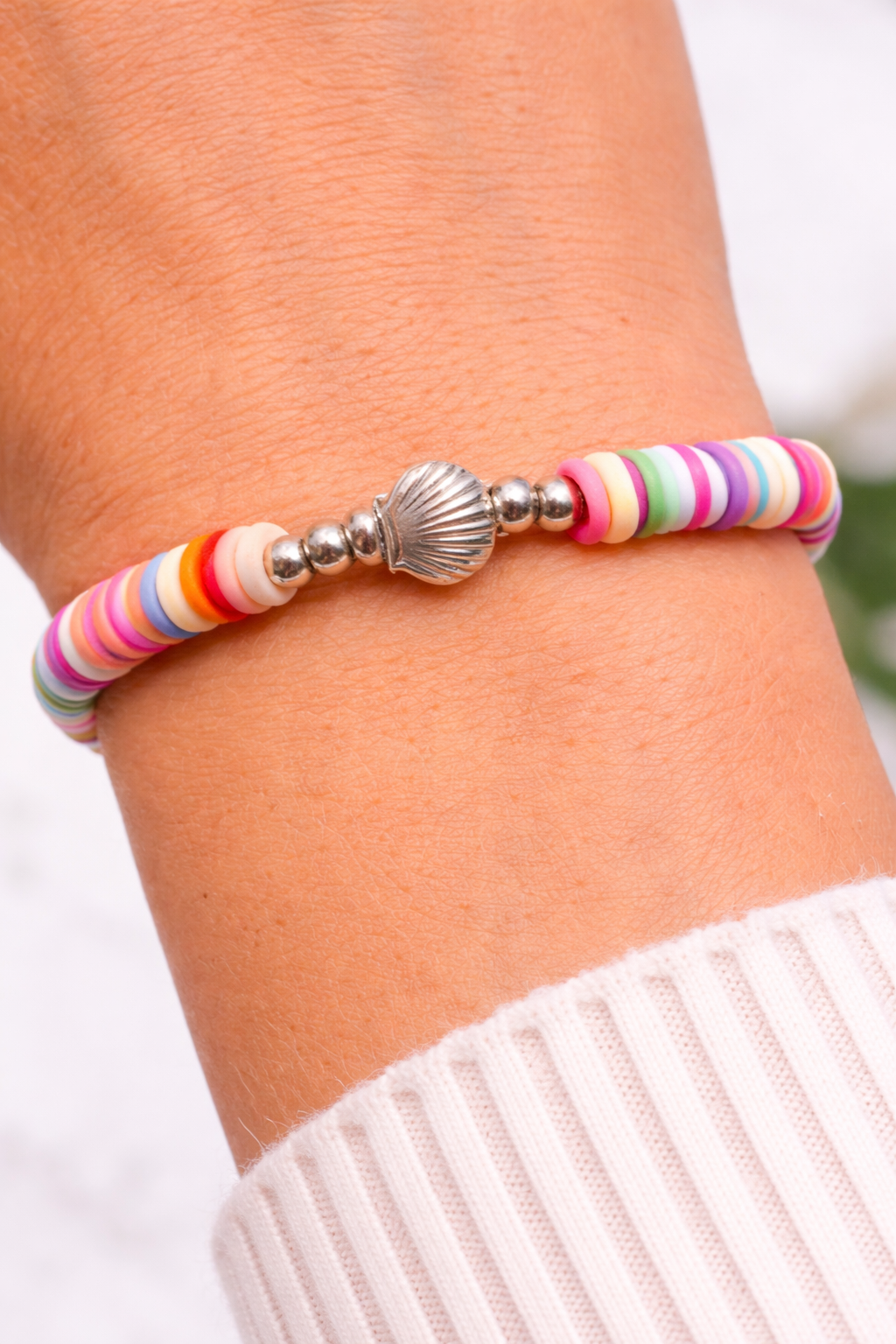 Pulsera elástica en fimo de colores con concha y cierre corredizo.