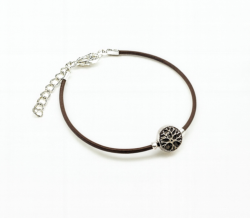 Pulsera Arbol de la vida, artesanal fabricada en hilo de cuero marrón de 1,5mm con mosquetón de acero ajustable.