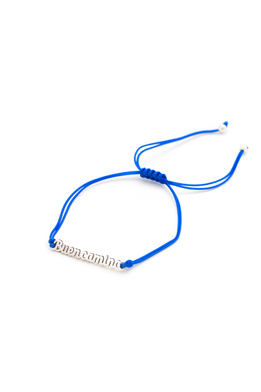 Pulsera en macramé presentada en 6 colores. Con piezas de texto «Buen Camino» de acero inoxidable y cierre de nudo corredizo.