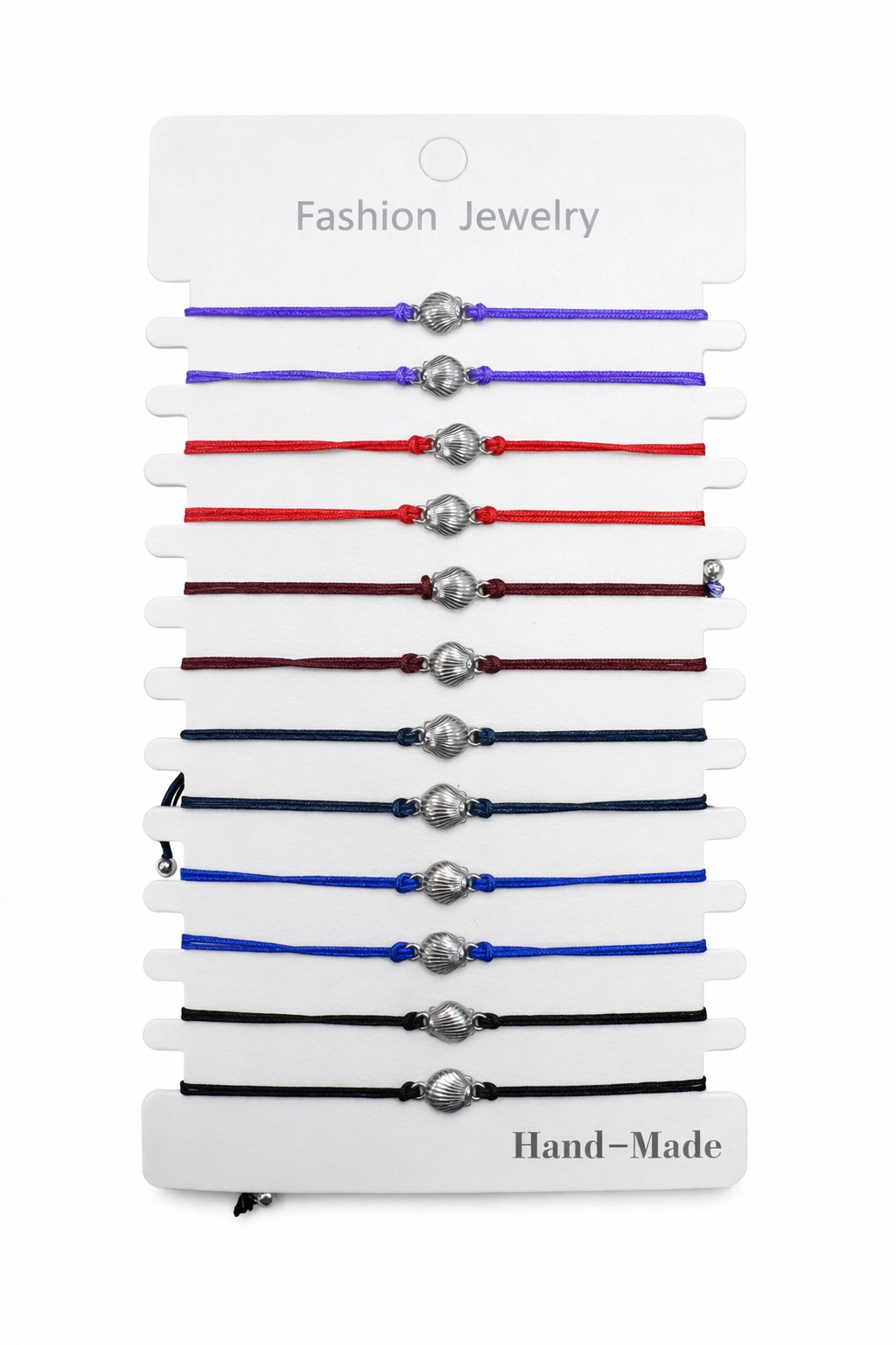 Pulseras ajustables hechas a mano con técnica de macramé, en hilos de colores y con concha central de acero, ideales para uso diario o regalo.