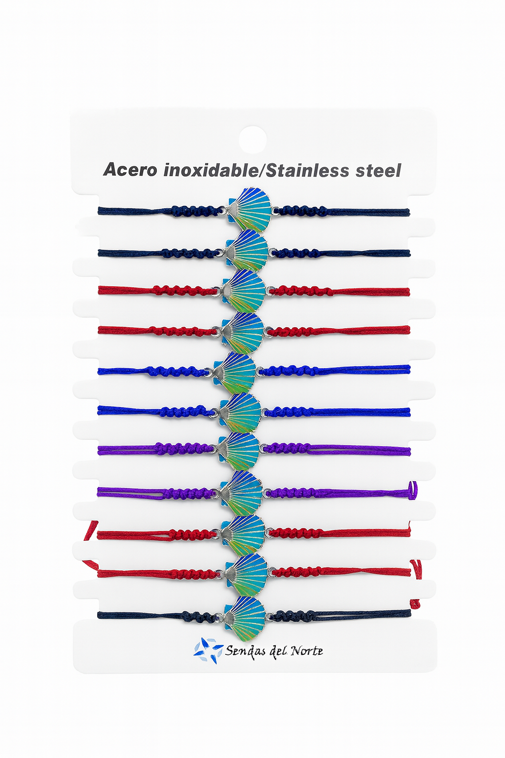 Pulsera en macramé presentada en 6 colores. Con piezas de concha color de acero inoxidable.