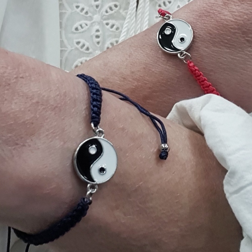 Pulsera en macramé presentada en 6 colores. Con piezas de Yin y Yang en nácar, con cordones ajustables.