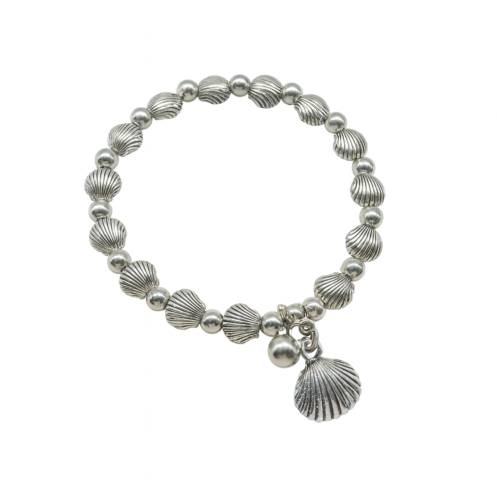 Pulsera elástica fabricada en metal con conchas y cascabel.