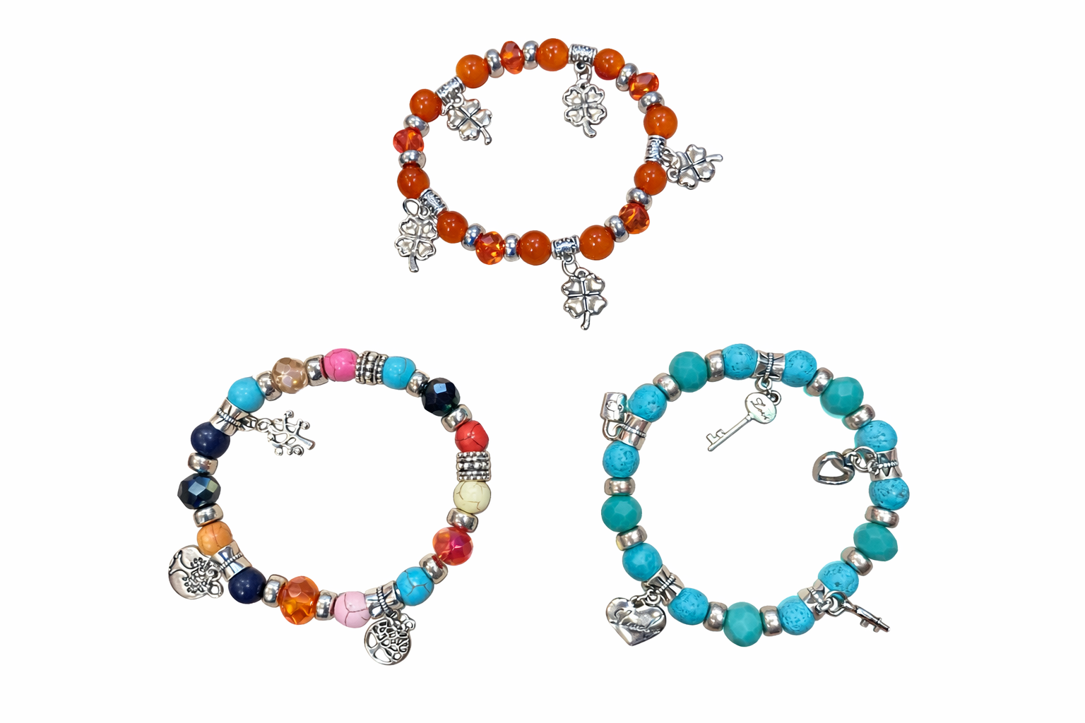 Pulsera elástica con dijes simbólicos, disponible en variedad de colores. Cada modelo incluye 4 pulseras por símbolo, combinando estilo, significado y versatilidad para cualquier ocasión.