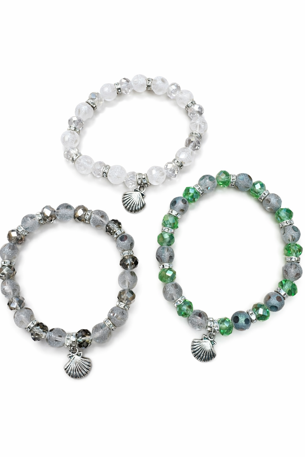 Pulsera elástica artesanal con cuentas brillantes y detalles plateados, inspirada en el Camino de Santiago y adornada con una concha símbolo del peregrino, que evoca viaje, espiritualidad y conexión con el mar