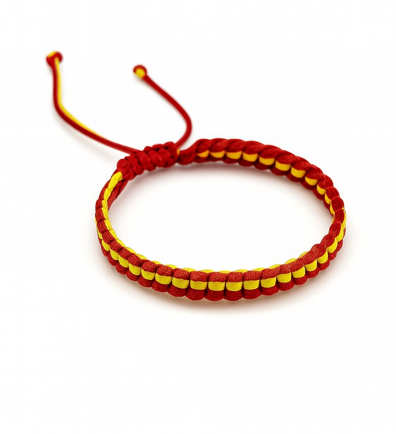 Pulsera trenzada con colores de España y cierre de nudo corredizo.