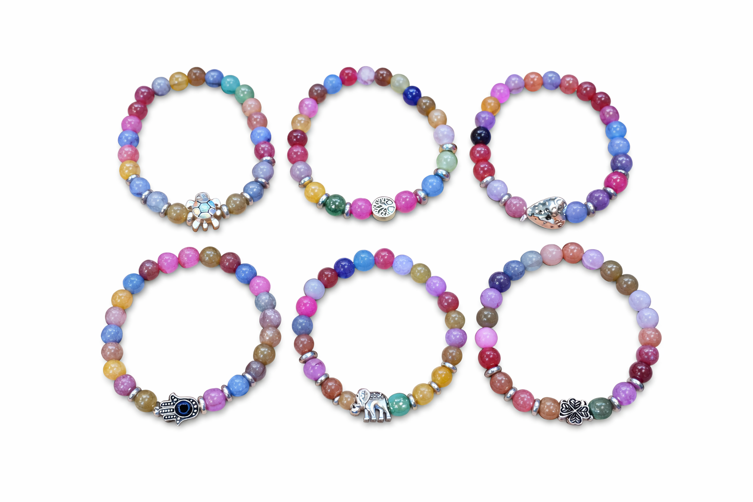 Pulsera elástica de cuentas multicolor con dijes decorativos, inspirada en la energía y armonía de los colores. Disponible en modelos surtidos para combinar a tu estilo